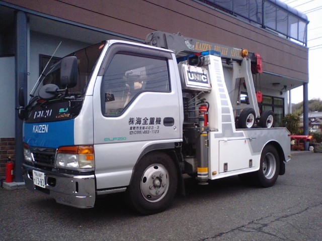 イスズ・エルフ2t (HB:2500mm) クレーン:ユニック製2.6t吊3段 電動ウィンチ:ラムゼイPRO9000 リフト:PD‐90・トキノブ改 リフト、加工前 リフト、加工後 オフセット仕様のタイヤ受けはアタッチメント式です。 時信レッカーセンターさんで加工して頂きました。 ローダウン車のオイルパン対策だけでなく、事故で片輪がパンクもしくは後方に下がっている場合などにも使えます。