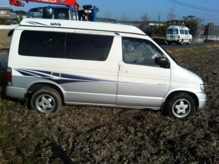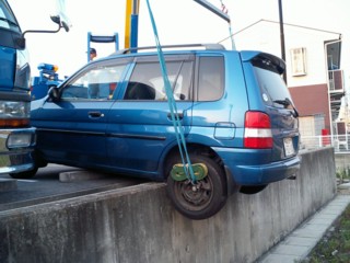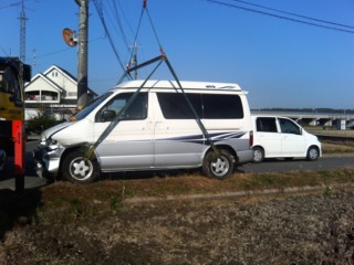 落ち込み車・引き上げ 田んぼに飛び込んだ車はウィンチ使用だけで引き出すことは難しい場合があります。 ユーザーと相談後、出来る限りタイヤ・ホイールをクレーンで吊り上げ道路へ復旧します。 後二輪を落輪の引き上げ作業